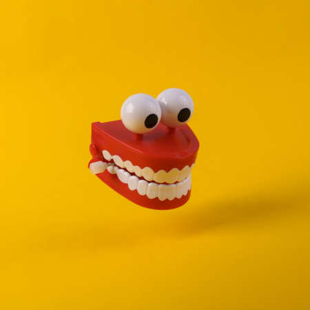 Levitating clockwork jaw on a yellow background with a shadow. Minimalism still life