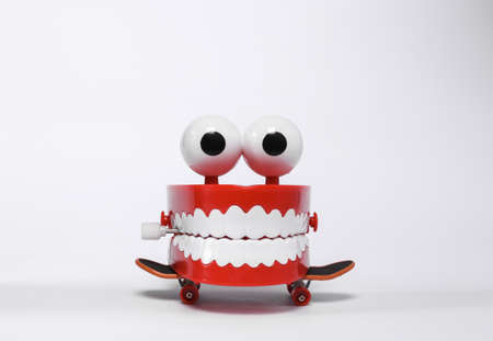 Clockwork joke jaw with skateboard isolated on white background