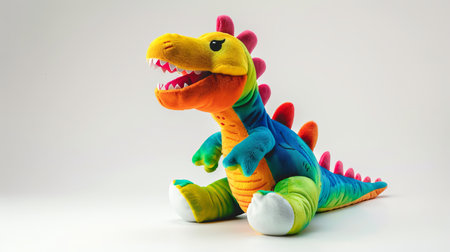 Colorful plush dinosaur toy on a white background. Concept of children's toy, playful gift, kids room decor. Copy space.
