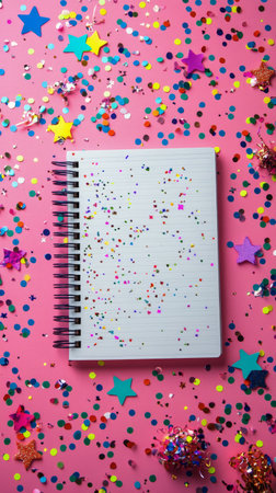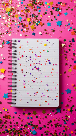 A blank spiral notebook rests on a vibrant pink surface covered with colorful confetti and decorative pieces, creating a festive atmosphere perfect for creativity and party planning.