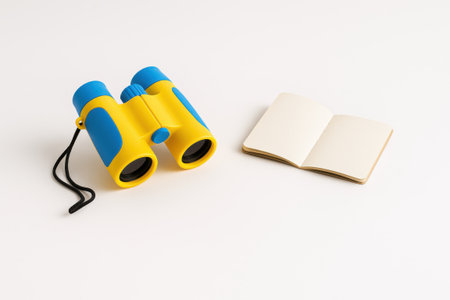 Professional studio photo child size rubber binoculars in bright yellow and blue near small open nature guide booklet with blank pages on white surface