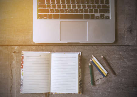 Blurred picture of note book paper on wooden background: vintage tone filter