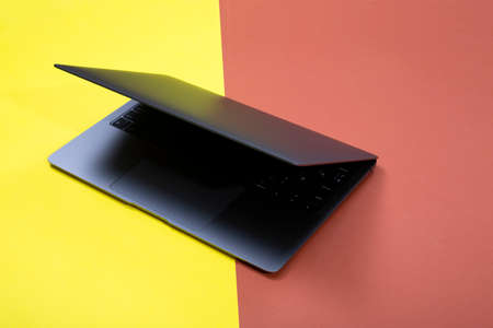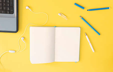 Laptop computer, open paper notebook and white pen on yellow color background. Top view, copy space for text. Lifestyle, project.