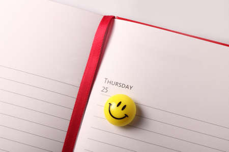 Open blank notebook on a wooden table, vintage tone and yellow emoticon
