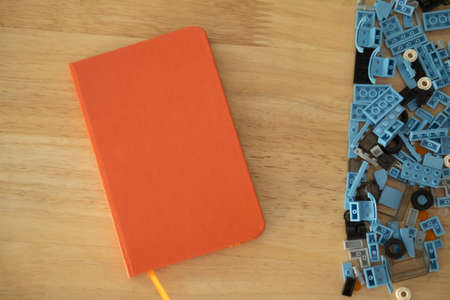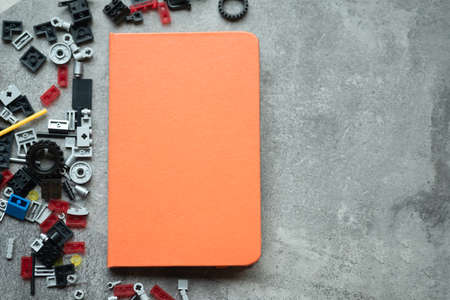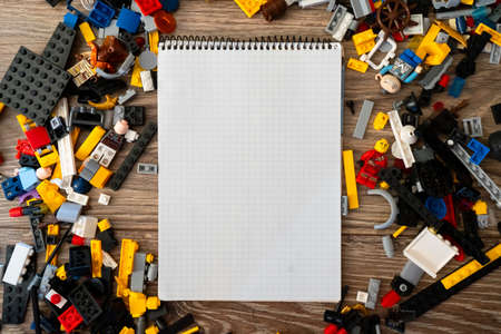 Empty paper notebooks and mini blocks plastic constructor colored. Concept of learn and play concept