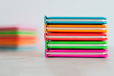 colourful children books piled on minimalistic marble desk setup, concept of learning to read, early education, and making school fun for kids through creativity and bright educational materials