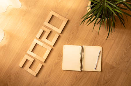 Conceptual of open notebook and taking note. with pen, wooden blocks on gray background top view. space for text horizontal image