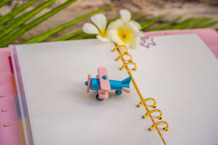 Notepad and stationery on wooden background. Planner for business and study. Fans of stationery. Travel planning notebook. Travel concept