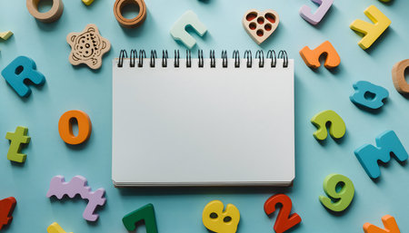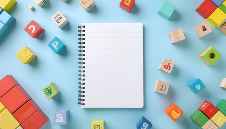 Educational wooden toys and blank sketchbook notebook for kindergarten learning and playing