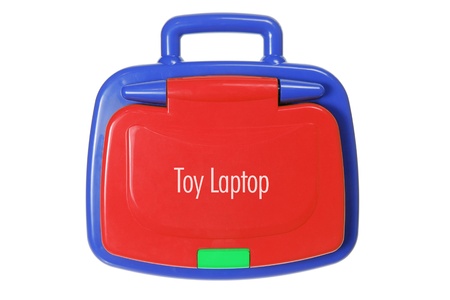 Laptop and toy bricks on a blue background. Childhood concept. Top view