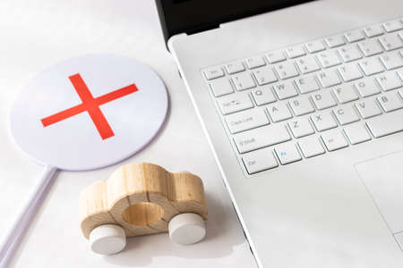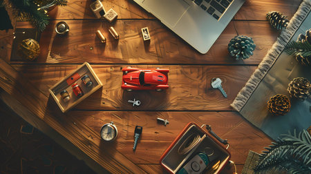 Top view of a desk with a laptop, a red car, a clock, a compass, a magnifying glass, a cactus and a pine cone, Generative AI illustrations.