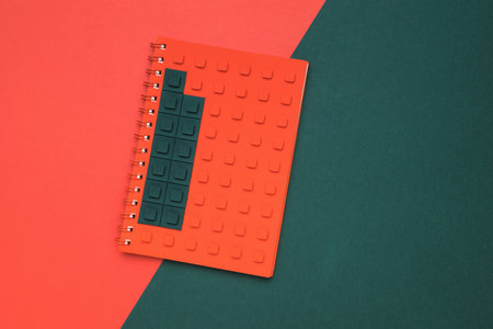 A copy space image of an empty notebook photographed from a top down perspective on a bicolor background