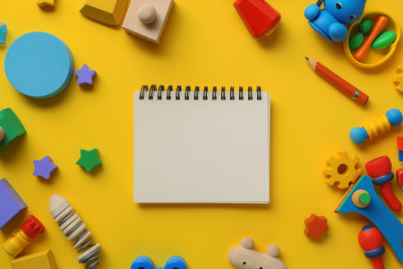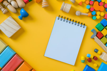 Educational wooden toys and sketchbook notebook on yellow background for early learning