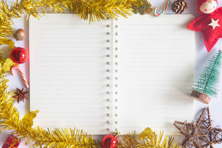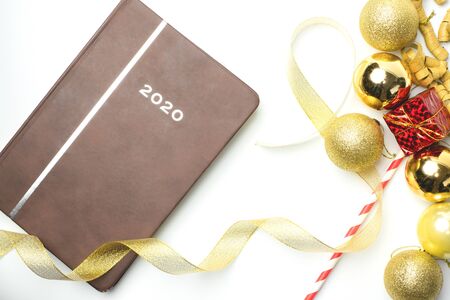 Christmas background, Merry Christmas greeting card idea with decoration of red gift with white and golden ribbon above vintage brown notebook with copy space for a happy holiday and new year 2020