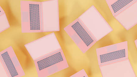 Multiple pink laptop blank screen on yellow background. laptop mock-up for your message. Minimal idea concept, 3D Render.