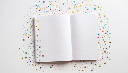 White notebook on a white background with scattered multicolored glitter stars. Place for text