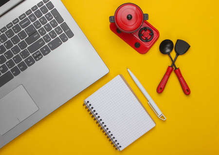 Toy kitchen, recipe notebook and laptop on yellow background. Search for recipes on the Internet. Top view