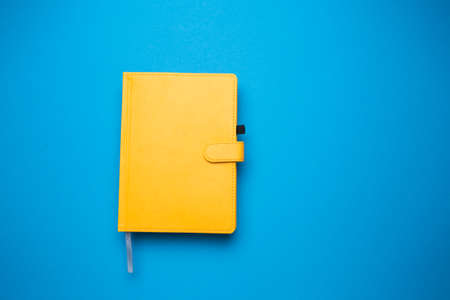 Blue notebook on a blue-orange background. Recording and accounting tools.