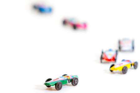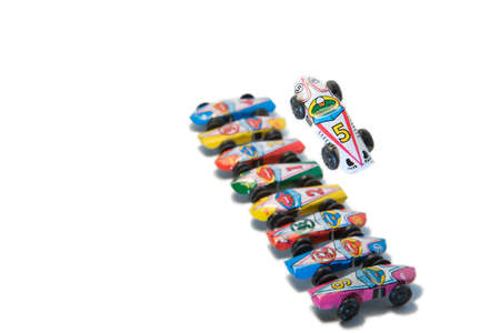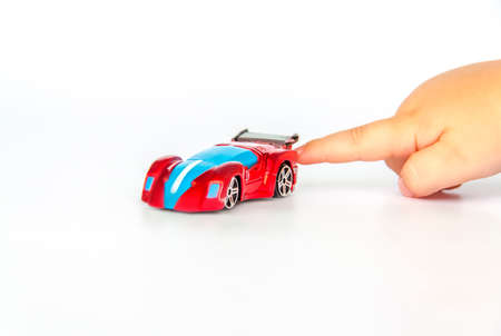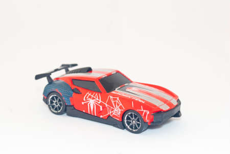 3d illustration of a colorful racing toy car on the blue isolated background.