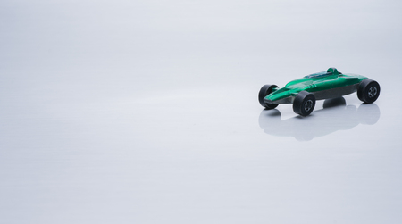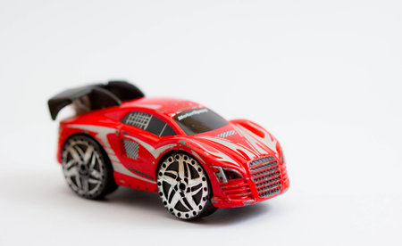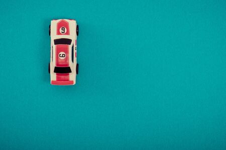 Red toy car placed on a desk and a green natural background. Selective focus. Copy space.