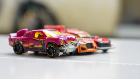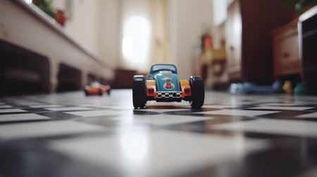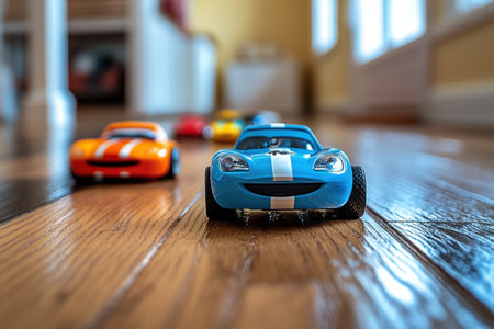 A group of colorful toy cars is lined up on a wooden floor, with a focus on a bright blue car leading the pack. The warm afternoon sunlight filters through nearby windows, creating a playful atmosphere.