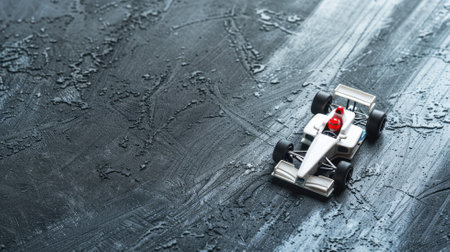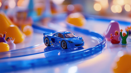 A realistic toy race car on a model racetrack, with dramatic lighting creating a competitive atmosphere