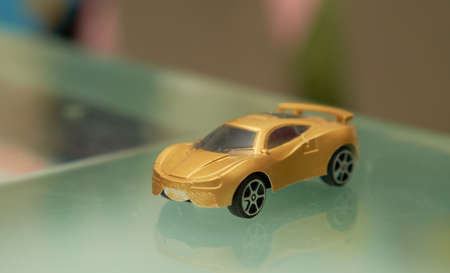 A yellow toy sports car with racing decals on a glossy surface, surrounded by colorful blurred toys in the background. High quality photo