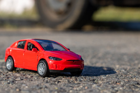 A small red toy car is parked peacefully on the side of the road, waiting for its next adventure or a child to play with it