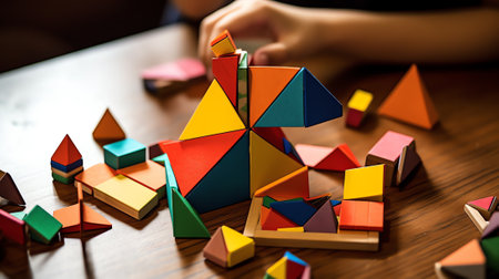 Explore a vibrant arrangement of colorful wooden shapes and blocks featuring geometric designs and soft shadows, perfect for educational and creative projects.