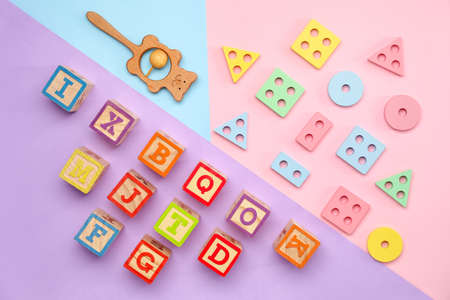 Colorful geometry toy blocks. Children game. 3D illustration