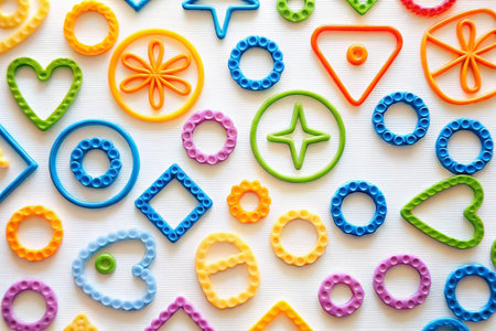 Colorful plastic shapes scattered on white background, ideal for crafting or education