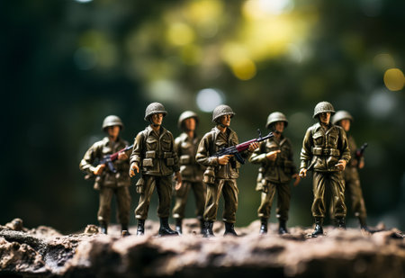 A vivid, close-up of miniature toy soldiers in varying uniforms