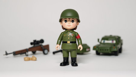 A charming, stylized cartoon toy soldier in a green uniform and helmet, holding a toy rifle, stands outdoors.