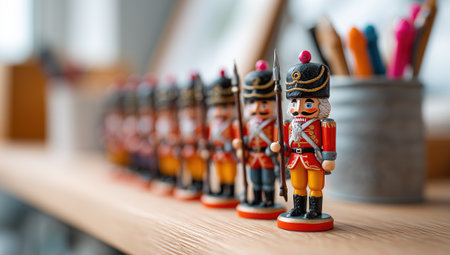 Nutcracker figures stand in a straight line on a shelf. Each figure wears a unique uniform and holds a weapon. Behind them, colorful pencils and pens are arranged in a container.