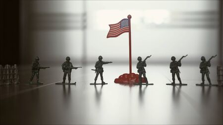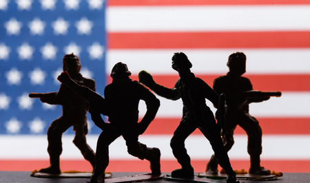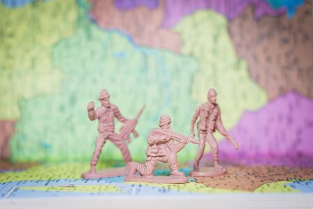 The concept of war and confrontation, political crises, toy tin soldiers attacking each other