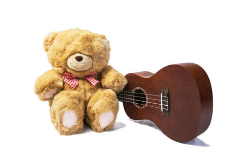 teddy bear with ukulele on white background