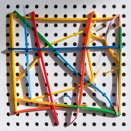 Brightly colored strings form a complex network on a surface, showing creativity and design in play.