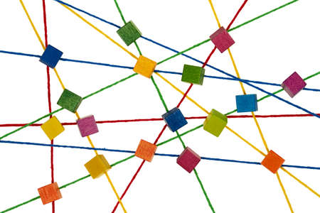Colorful wool threads form a network between colorful cubes