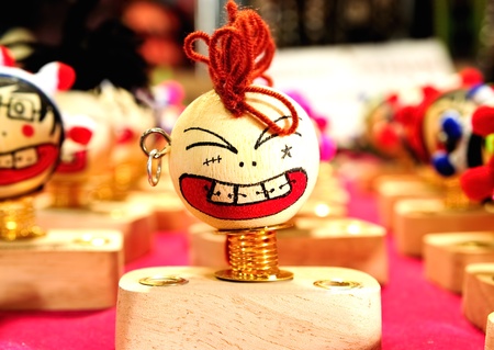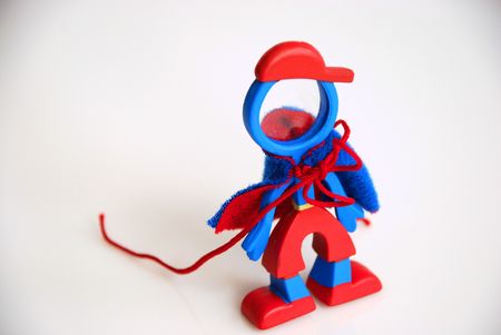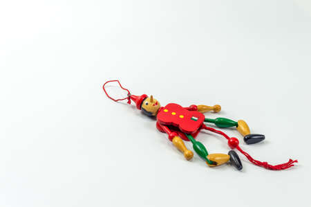 The wooden doll toy has a red-green color on a white background.