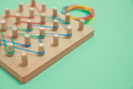 Wooden geoboard with rubber bands on green background, closeup with space for text. Educational toy for motor skills development