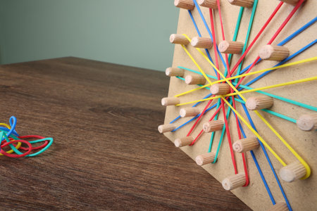 Wooden geoboard and rubber bands on table, closeup with space for text. Motor skills development