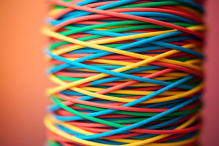 This vibrant image showcases a colorful abstract network of twisted strings and threads, creating a visually stunning and intricate pattern that evokes creativity.
