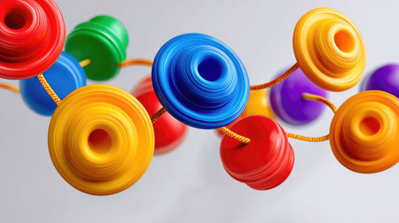 This vibrant and playful abstract composition features colorful spinning discs connected by cords, creating a dynamic visual experience with a modern aesthetic.