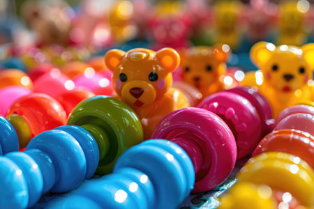 Pile of colorful plastic toy bears. Selective focus. Toned.