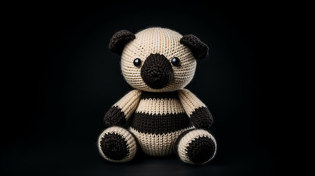 the adorable knitted panda bear toy sits serenely against a pristine white background, showcasing its intricately stitched fur and endearing facial features, perfect for cuddling and playtime, making it a delightful addition to any nursery or child's toy collection, evoking feelings of warmth and comfort. ai generated