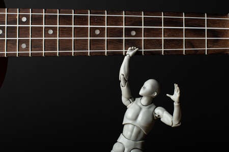 A man hangs on the strings of a ukulele. The man gripped the string tightly. Music in our hearts.
