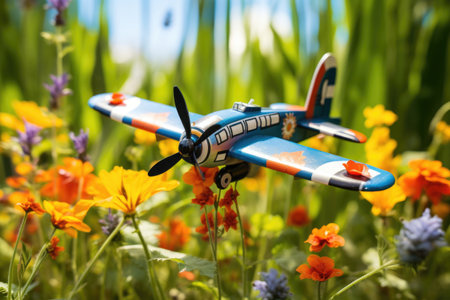 toy plane among wildflowers with a butterfly hovering over it, created with generative ai