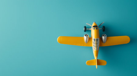 Bright yellow airplane model resting on a turquoise background showcasing aviation artistry
