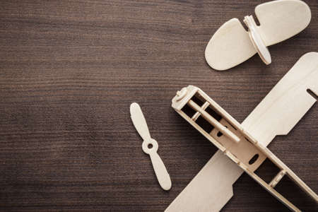 Wooden toy plane on wood table background.