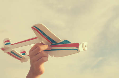 A white airplane in a childs hand against a blue sky. The concept of a dream of travel and flights.